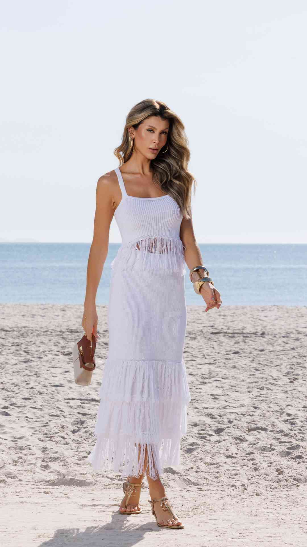 Tricô leve com toque macio, composto por top cropped de alças finas com franjas na barra e saia midi ajustada com franjas na barra e cós confortável. Perfeito para looks de praia ou produções casuais com estilo.