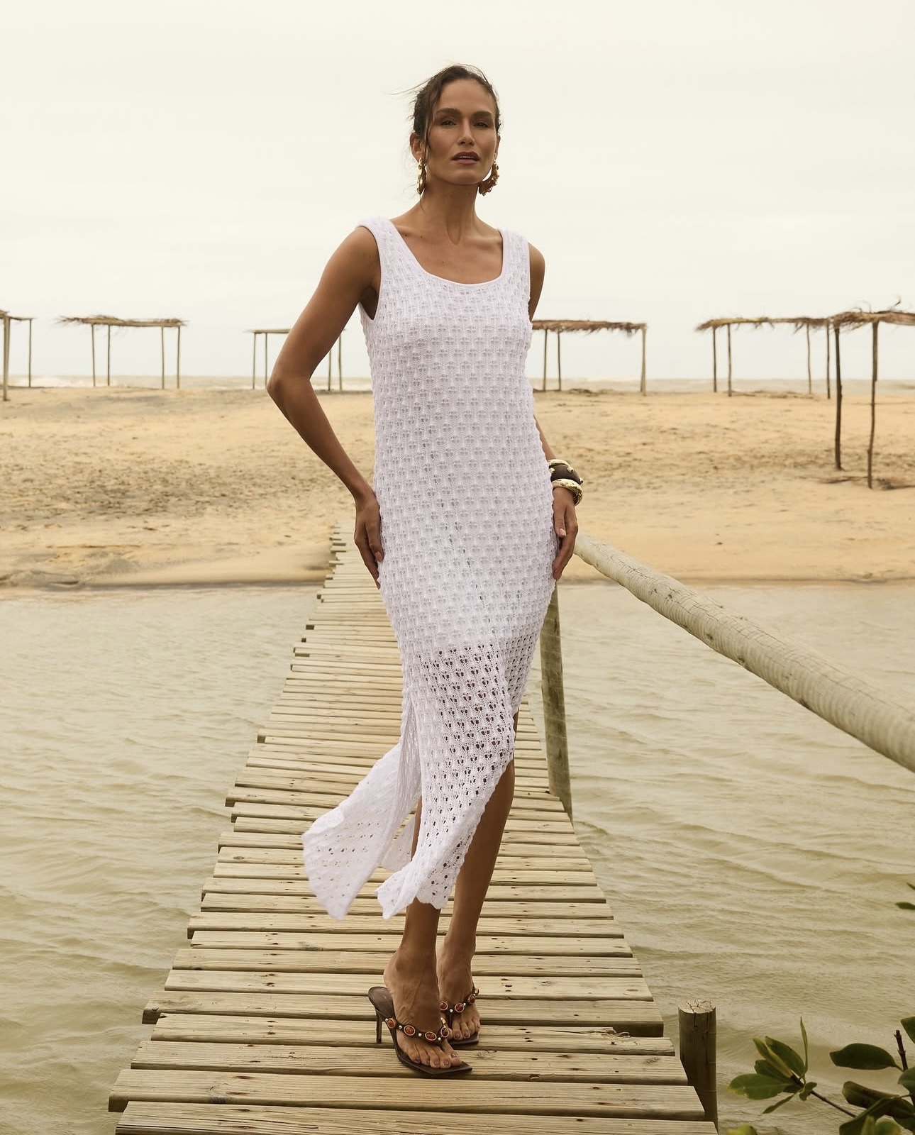 Elegância que se revela na textura. O ponto ouriço cria um efeito tridimensional marcante, com um apelo sensorial que se revela no toque e no movimento. O decote quadrado valoriza o colo com linhas limpas, enquanto as alças largas proporcionam conforto e sustentação ao vestir. As fendas laterais acrescentam leveza e sensualidade na medida certa.